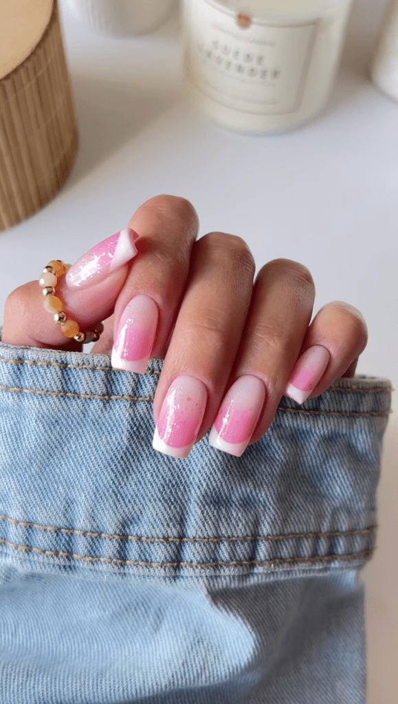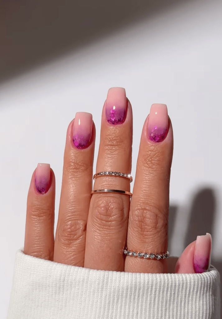 Add a touch of sparkle to your pink nails with glitter accents. Whether as tips, accents, or full coverage, sparkle details elevate your manicure, capturing the essence of summer’s joy and celebration. This gorgeous ombre style strikes the perfect balance between elegance and daring.