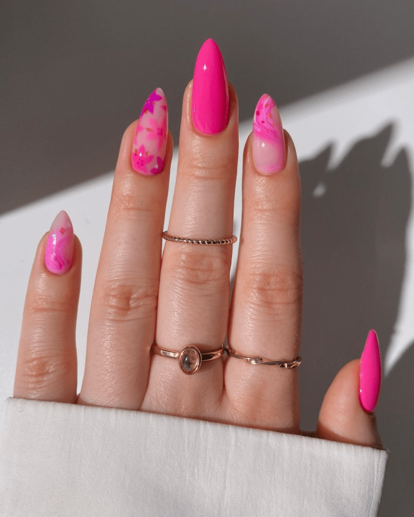 Bloom into summer with pink nails featuring floral designs. Whether dainty petals or bold blooms, floral nail art adds a touch of nature’s beauty to your manicure, embodying the essence of a vibrant season.