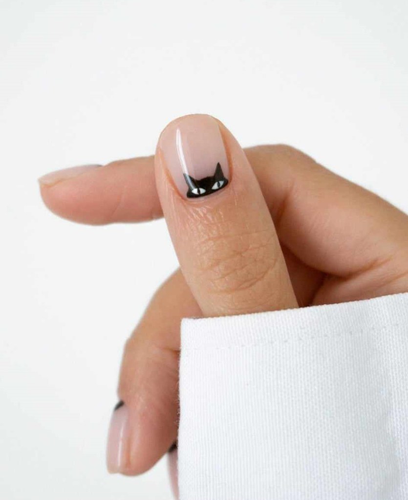 Channel your inner cat lover with this spooky yet adorable design featuring black cats. These nails often highlight a single accent nail with a detailed black cat, while the rest of the nails remain in soft, neutral tones. It’s a cute and playful design, perfect for Halloween enthusiasts who also adore their feline friends.