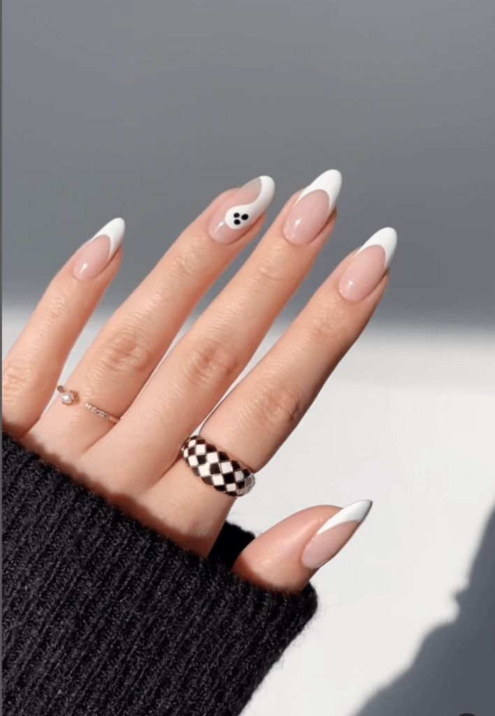 This creative twist on the French manicure incorporates pumpkin accents for a festive fall look. The classic white tips are paired with tiny orange pumpkins on one or two nails, making for a fun and elegant autumnal design. It’s a perfect balance of classy and seasonal!