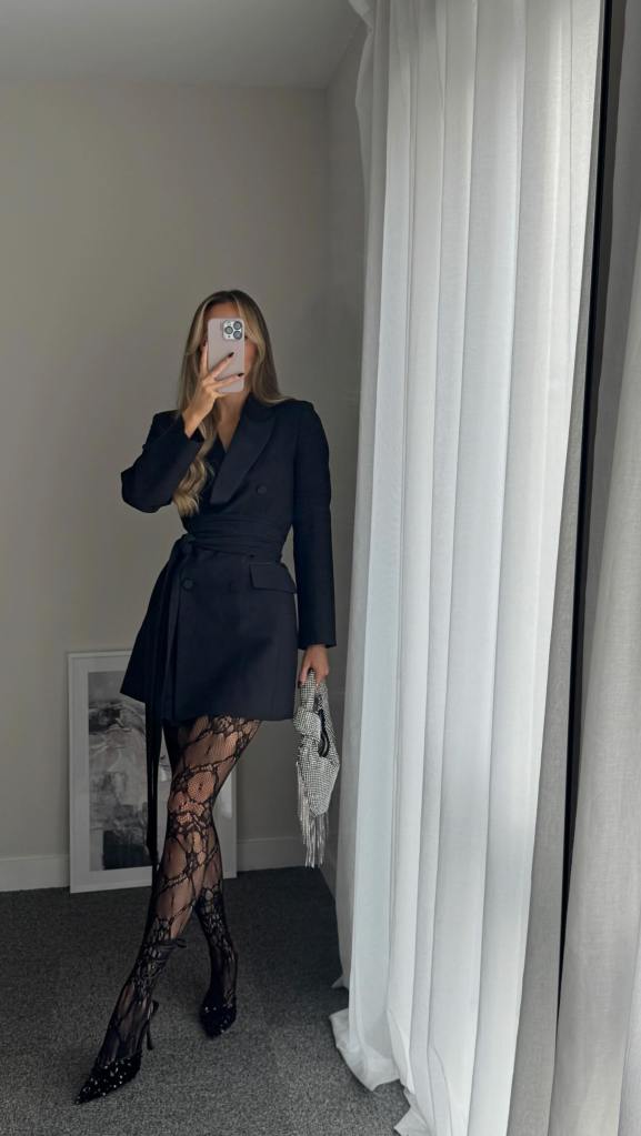 Combine power dressing with holiday flair in a structured blazer dress. This modern take on festive wear exudes confidence and style. Pair it with knee-high boots or embellished heels, and add a bold lip color to complete the outfit.