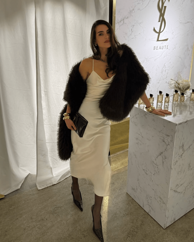 Embrace old Hollywood glamour with a satin midi dress layered with a faux fur wrap or stole. The silky texture of satin combined with the warmth and elegance of faux fur creates an outfit that’s perfect for upscale holiday events or formal dinners.
