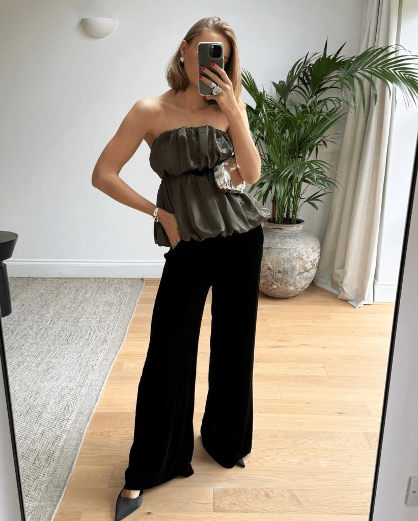 Channel your inner fashionista with high-waisted wide-leg trousers paired with a chic accent top. Choose luxurious fabrics like silk or satin for a festive vibe, and add a metallic belt or bold earrings to elevate the look. Perfect for cocktail parties or chic gatherings.