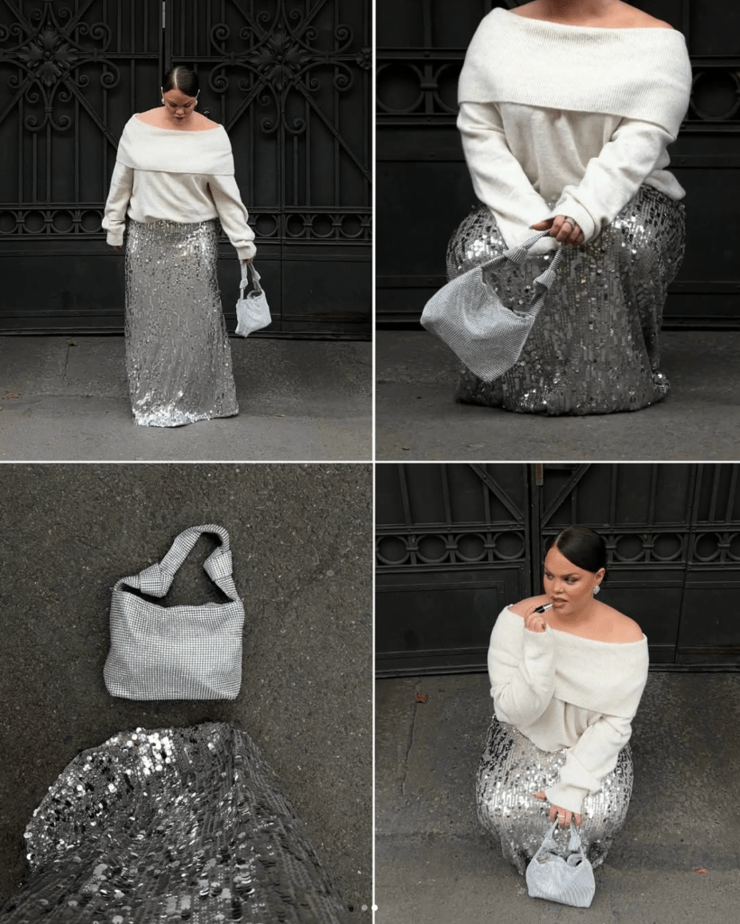 Blend comfort and shine with a pleated metallic skirt/pants and an off-shoulder sweater. This look is perfect for holiday brunches or casual evening parties, offering a festive yet relaxed vibe. Style with heeled ankle boots and a crossbody bag for a chic finish.