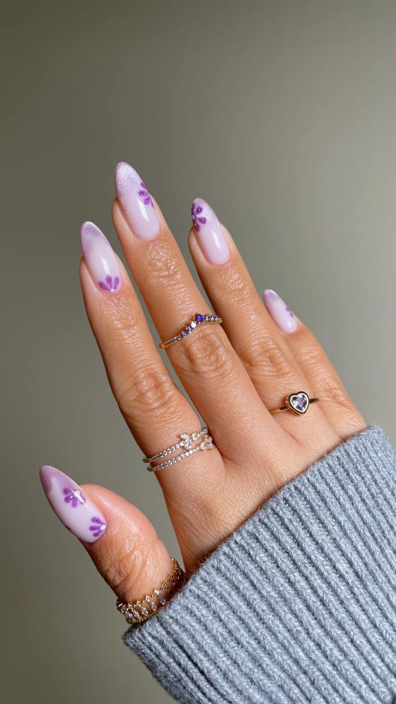 Cat eye nails are known for their magnetic, 3D effect, and when combined with purple floral designs, the result is mystical and mesmerizing. Using a magnetized polish, you can create a velvet-like sheen that shifts with movement. Adding delicate violet or lavender flowers enhances the dreamy, celestial vibe of this look. Perfect for those who love unique and eye-catching nails.