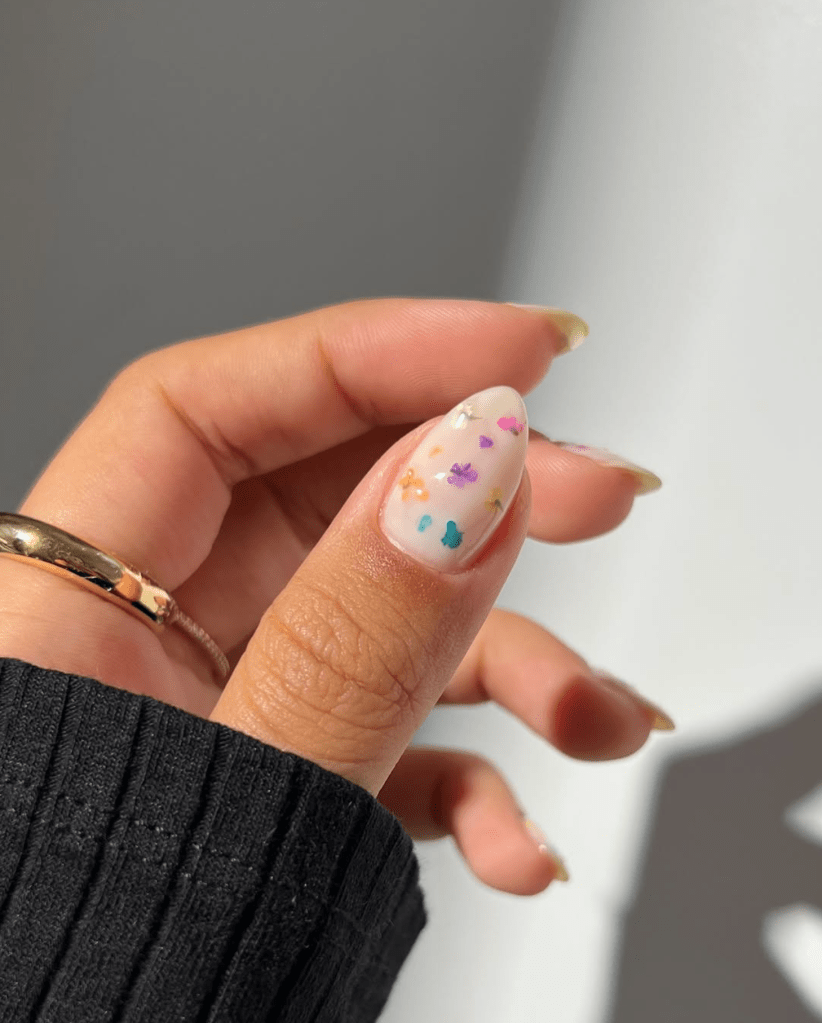 Milk bath nails are a soft, ethereal trend featuring delicate dried flowers encapsulated in a sheer milky white or nude base. This subtle yet sophisticated look gives the illusion of flowers floating in a creamy, translucent finish. Ideal for brides, spring lovers, or those who prefer a minimal aesthetic, this floral nail design pairs beautifully with pastel colors, gold flakes, or soft ombré effects. The result? A natural, feminine, and effortlessly chic manicure.