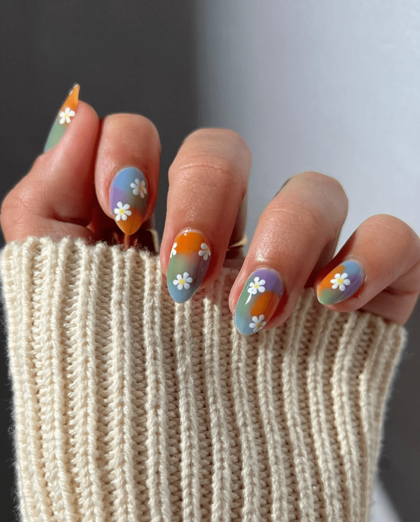 Multicolored Base & Little Daisies: Playful & Whimsical Floral Nail Art